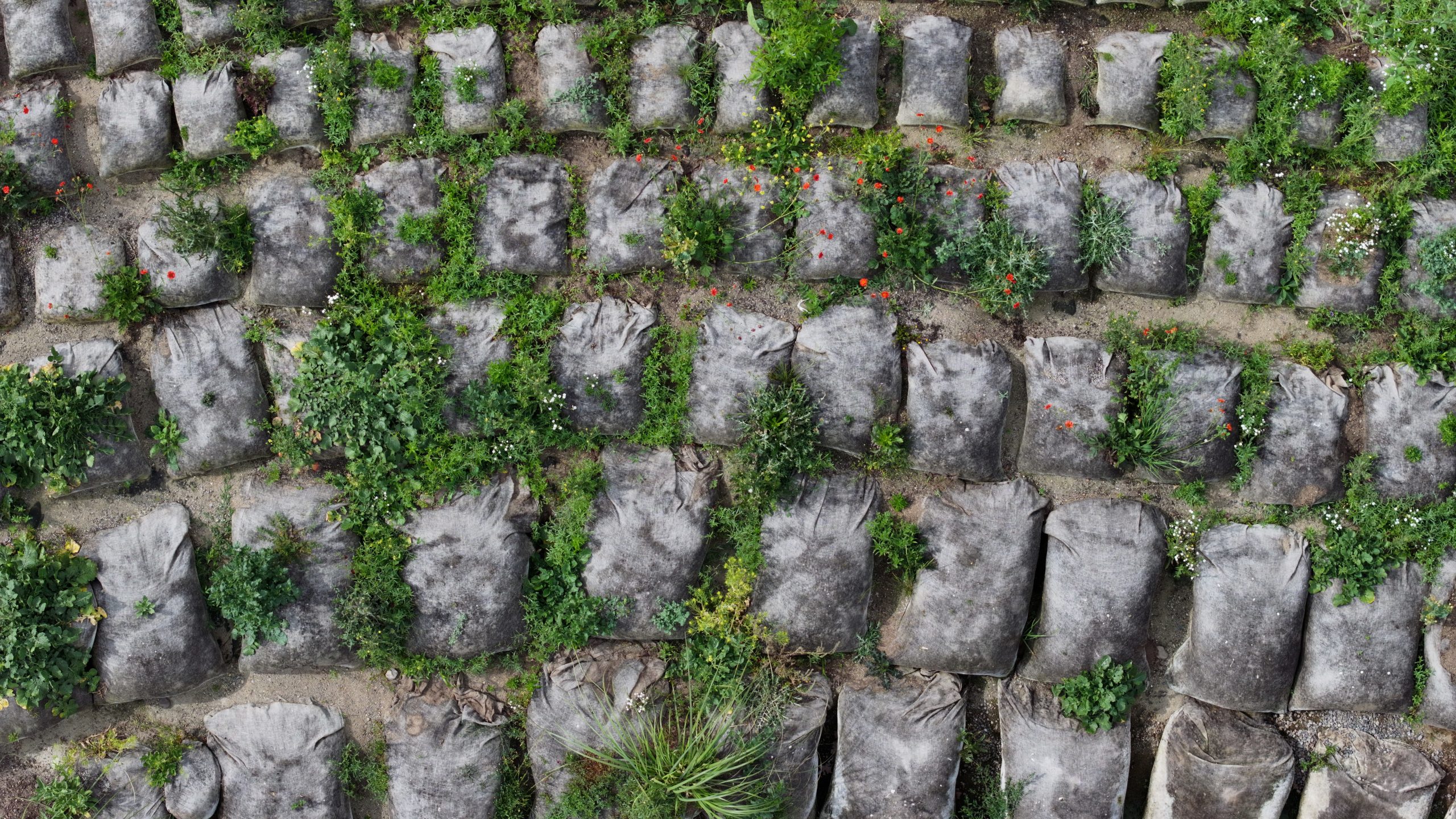 El anillo de vegetación que ha crecido en el Espejo Cosmobotánico es producto de la instalación de más de 1.500 sacos cargados de tierra orgánica y semillas, creando con el paso de los meses una masa vegetal de hierbas, juncos y una creciente población de insectos, aves y mamíferos que han encontrado aquí un hogar y espacio de resguardo.